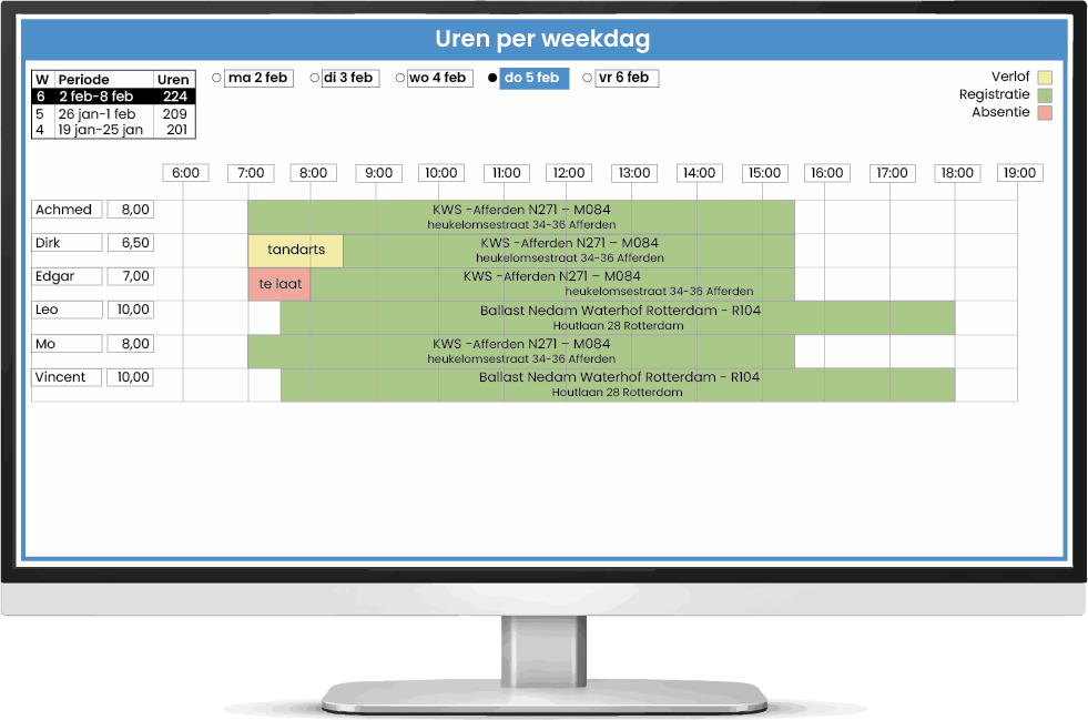 Afwijkingen vallen meteen op. Denk aan een medewerker die eerst naar de tandarts is geweest of iemand die een uur te laat is gestart. Je ziet het direct zonder extra controlewerk.